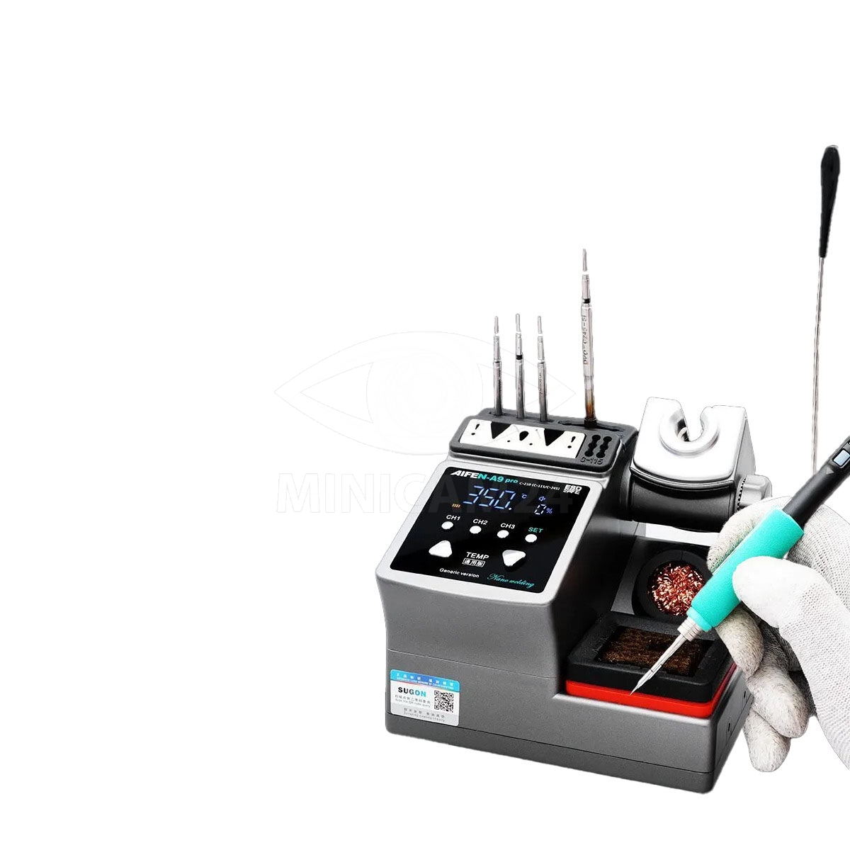 Паяльник AIFEN A9 Pro имеет компактные габариты (240 х 210 х 177 мм) и встроенный держатель.